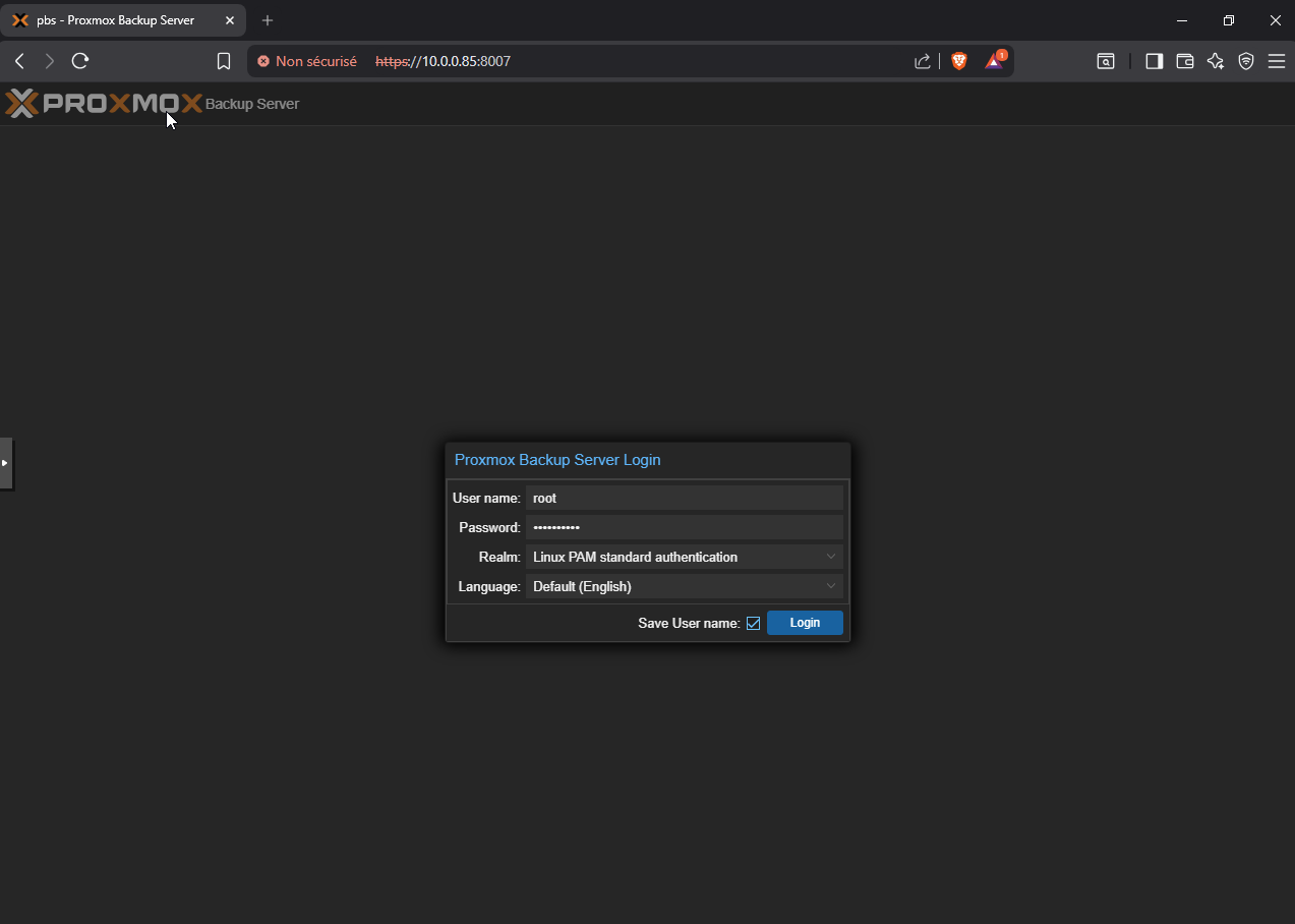 Pour se connecter on ira sur https:10.0.0.85:8007 (port 8006 étant le ProxmoxVE server) et on se connecte en root avec le mdp créé lors de l'installation