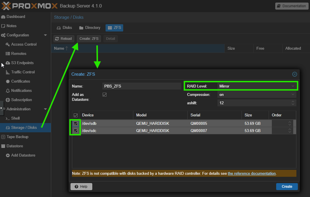 On va créer une ZFS en Miroir (on pourrait se mettre en RAID Z si on avait 3 disques)