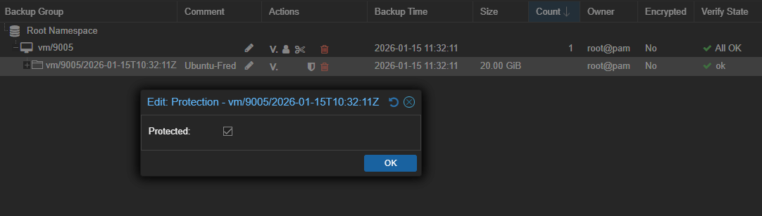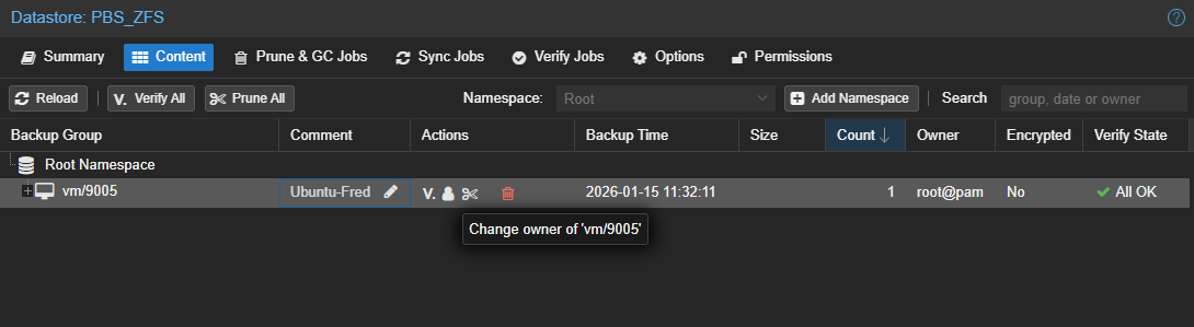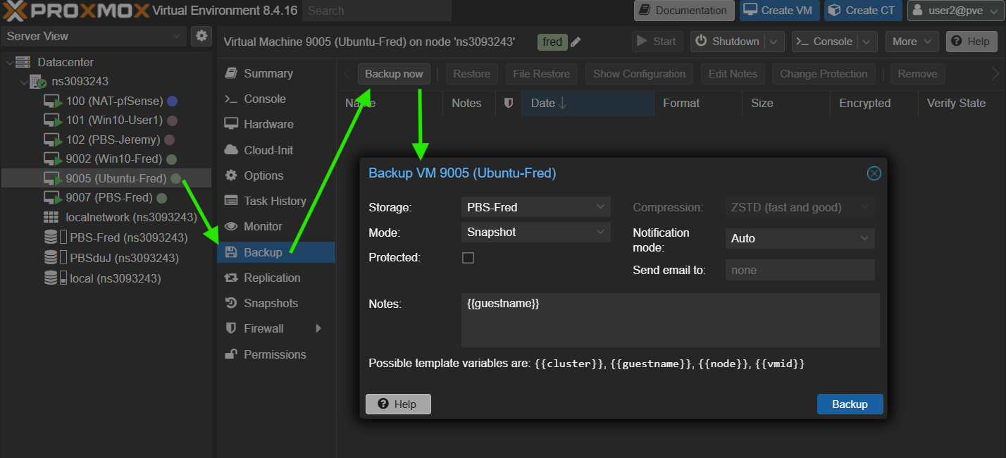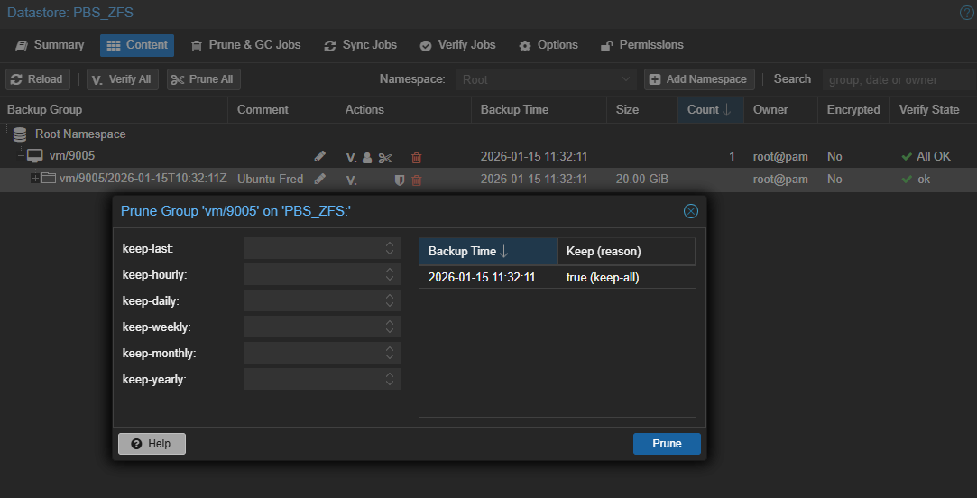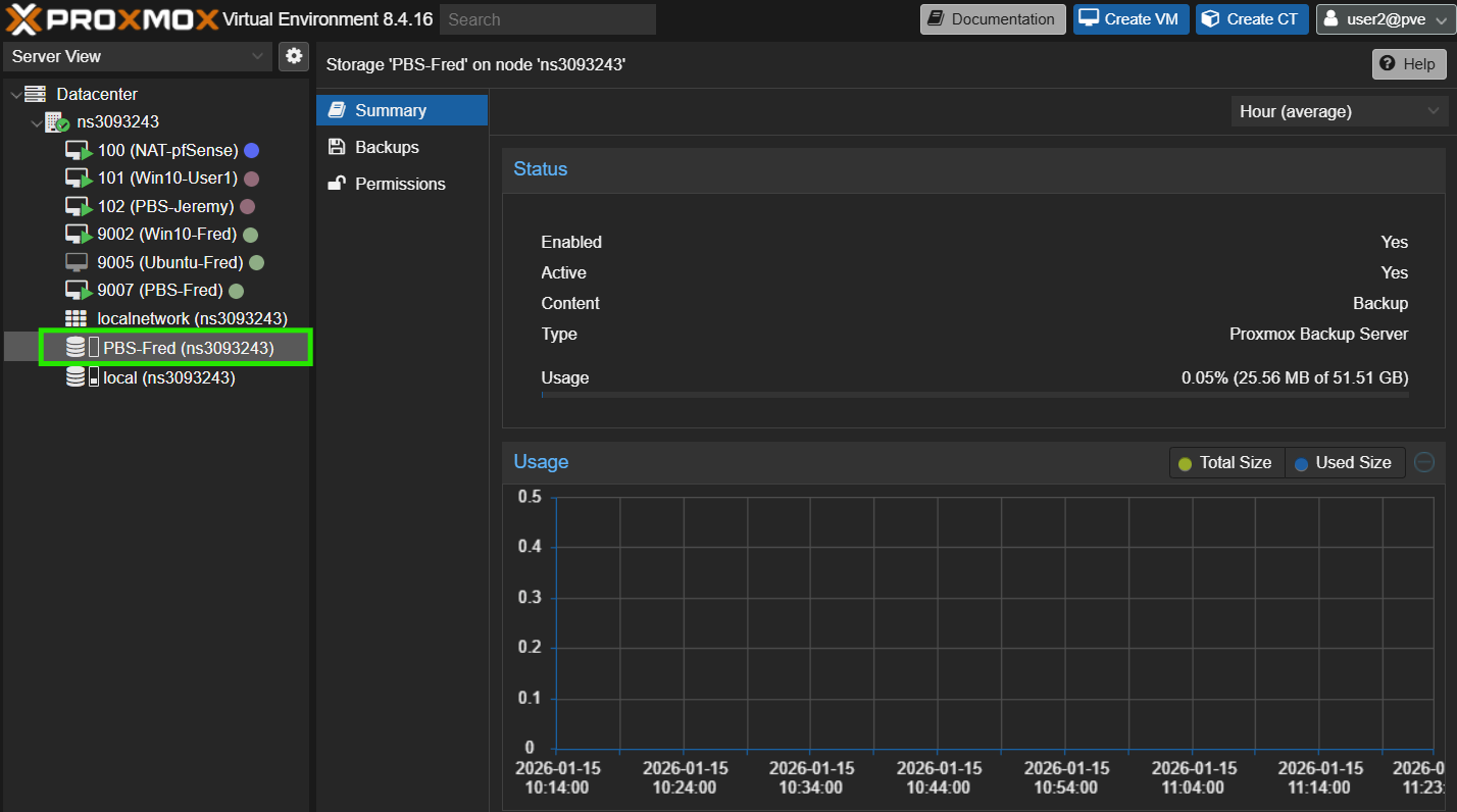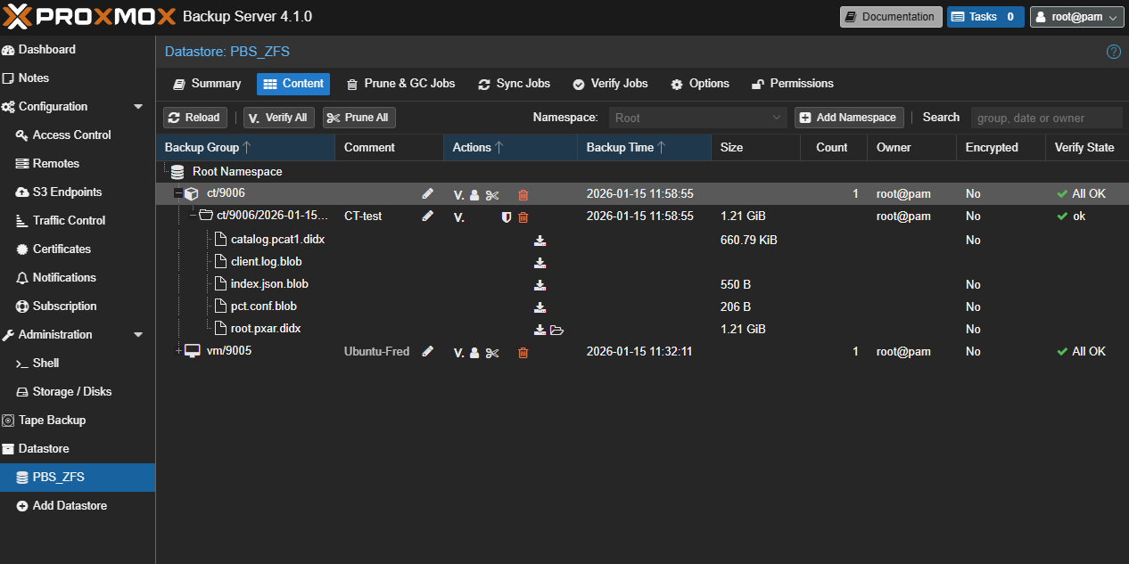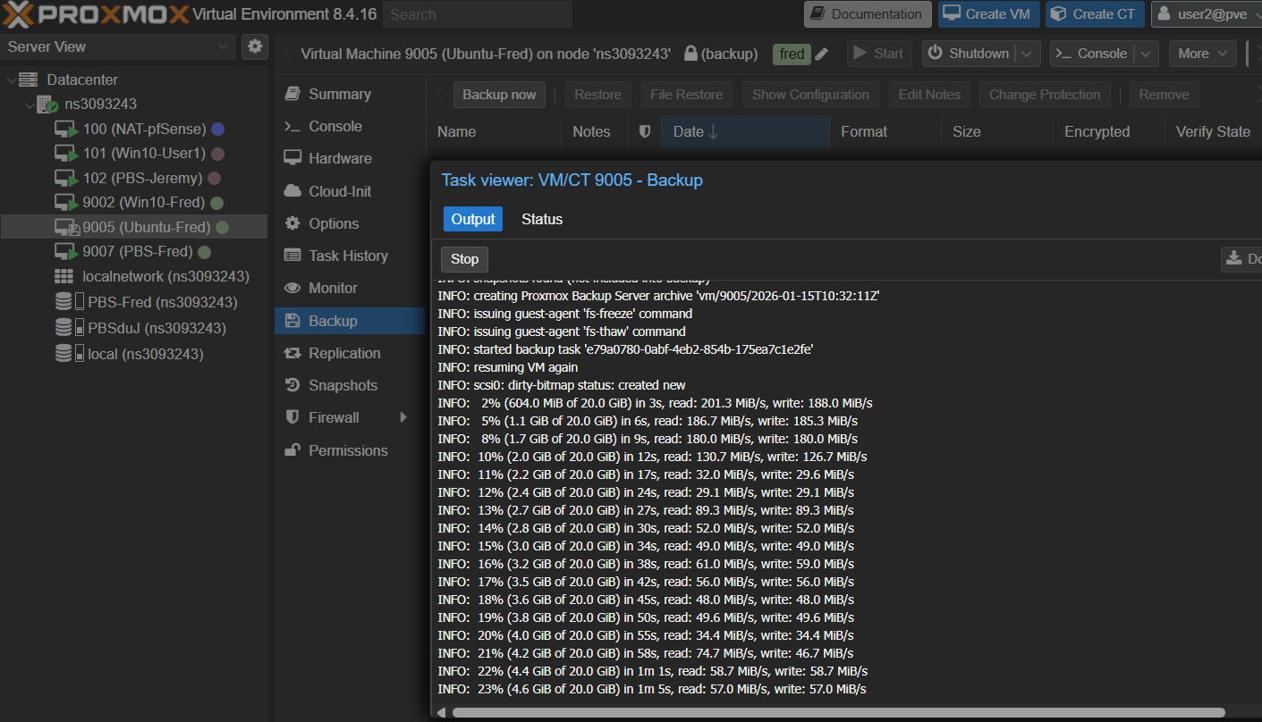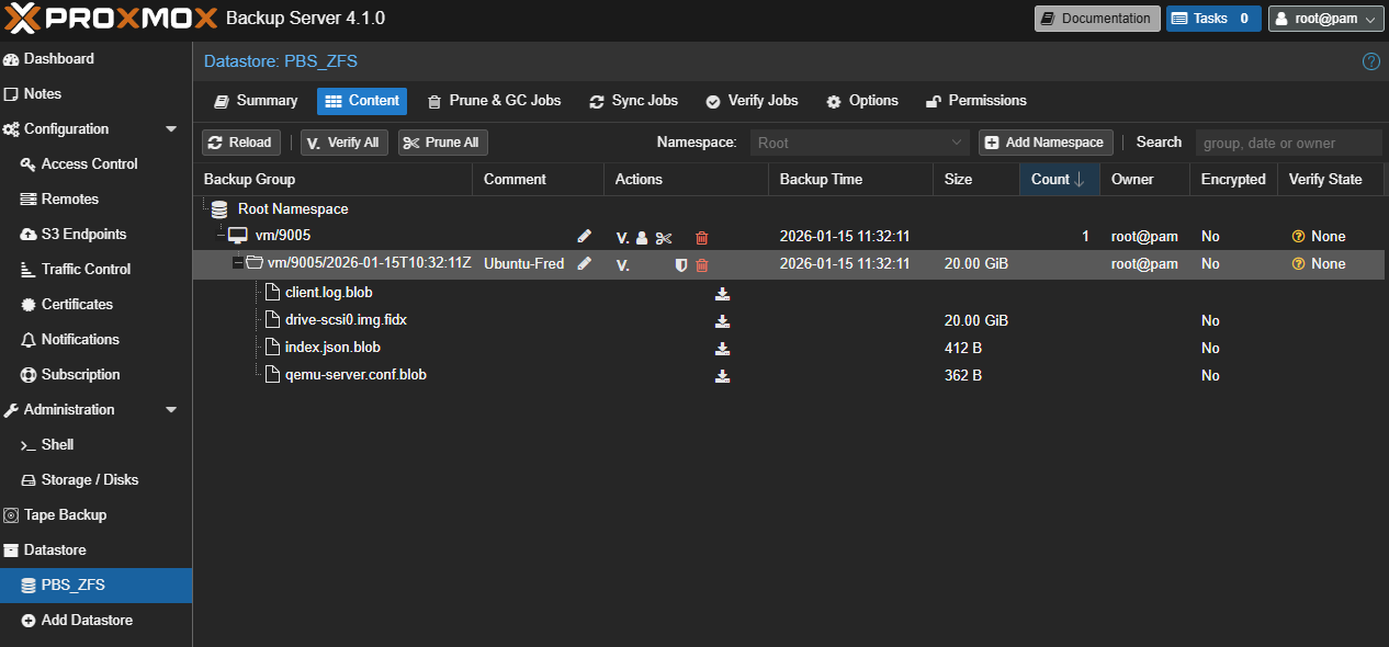 On peut retrouver la Backup sur ProxmoxVE dans notre VM, sur le Storage PBS et surtout dans PBS directement dans le Datastore