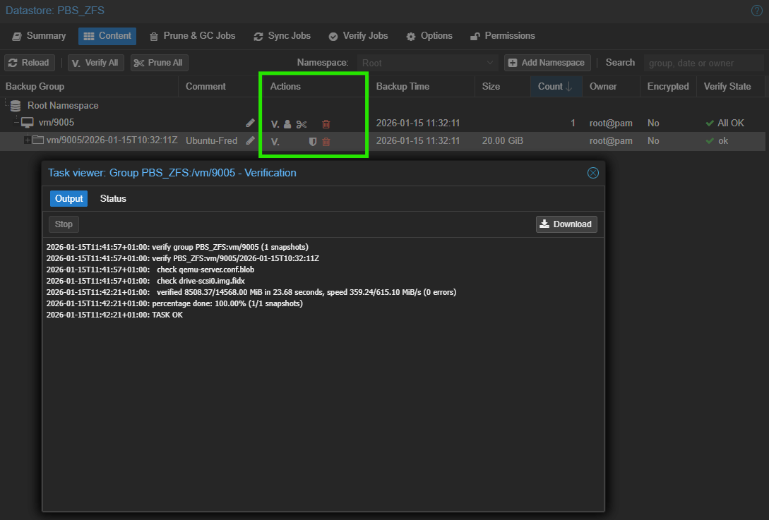 On a des actions disponibles directement : V pour Verify la sauvegarde