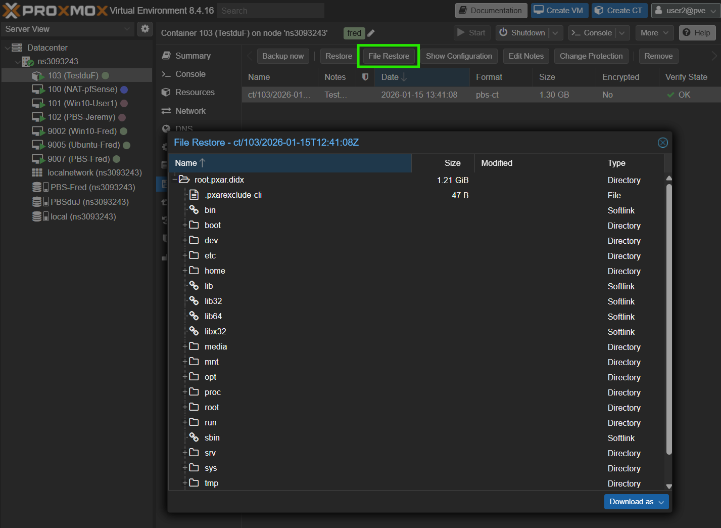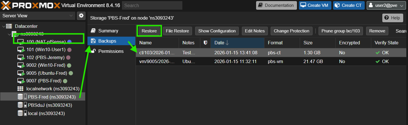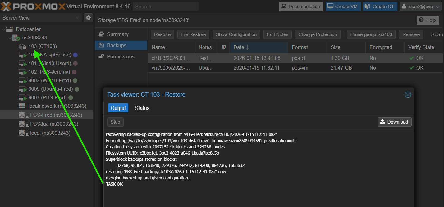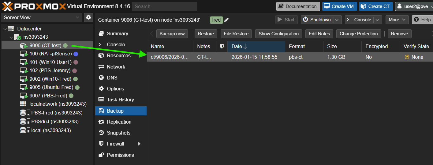 On supprime le container, on peut retrouver la backup dans le PBS sur ProxmoxVE et lancer la restauration
