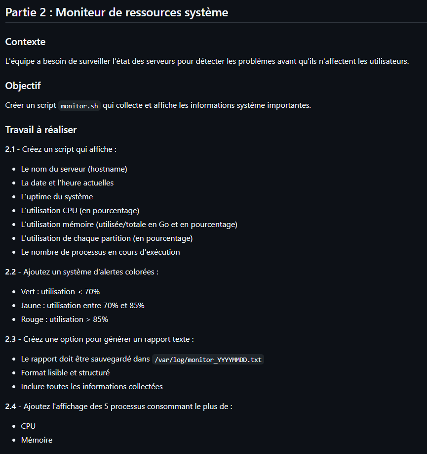 echo "2. monitor.sh : Affiche CPU/RAM/Disque et alerte si surcharge."