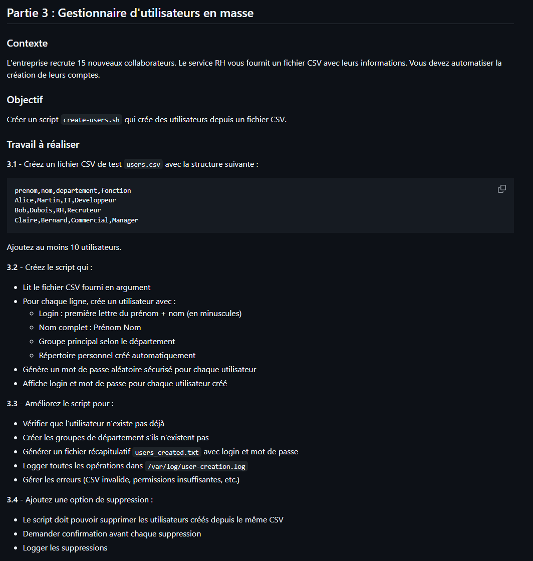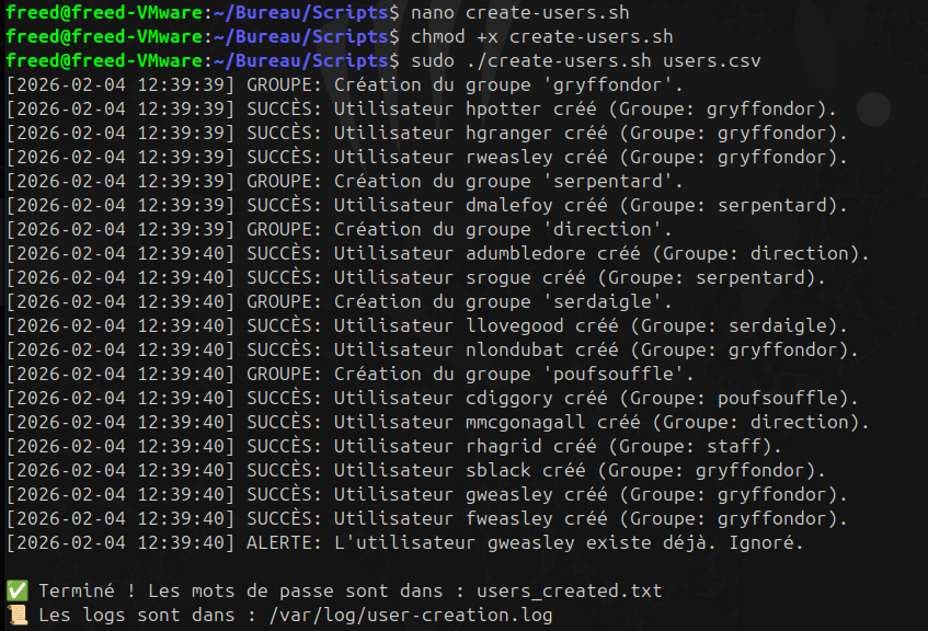 echo "3. create-users.sh : Crée/Supprime des users depuis un CSV et génÚre des mots de passe."