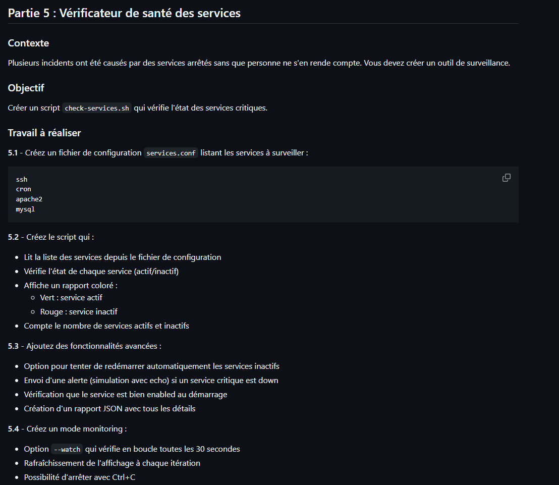 echo "5. check-services.sh : Vérifie SSH, Cron, etc. et tente de les redémarrer."