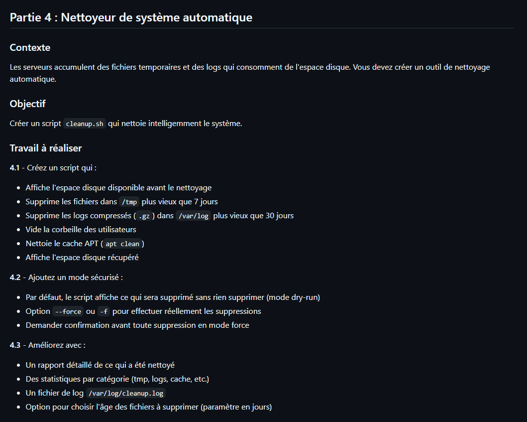 echo "4. cleanup.sh : Vide /tmp, cache APT et vieux logs. (Utiliser --force)."
