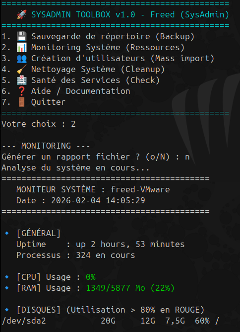 Une suite d'outils Bash pour l'administration systÚme automatisée, développée dans le cadre de l'atelier Scripting.