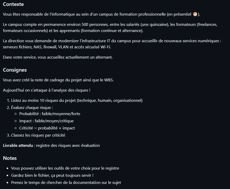| R01 | Retard livraison matériel (Switch/Firewall) | Fournisseur | 3 | Projet Bloqué (Impossible d'installer) | 3 | 9🟥CRITIQUE | Commander le matériel J+1 après validation. Vérifier stock fournisseur avant commande. |