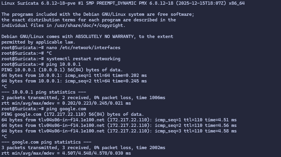(Dans un CT c'est généralement eth0, dans une VM Proxmox avec VirtIO c'est ens18)
