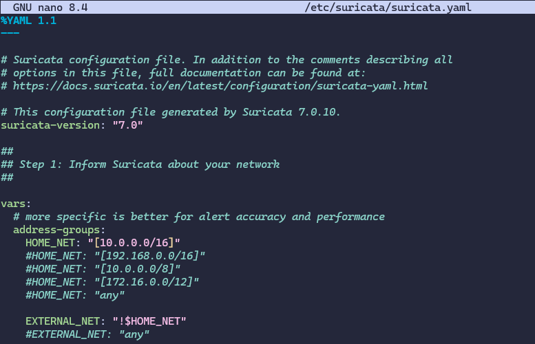 💡 HOME_NET correspond à notre réseau LAN. Suricata utilise cette variable pour savoir quel trafic est "interne" et quel trafic est "externe". Si HOME_NET est mal défini, les règles ne se déclencheront pas correctement.