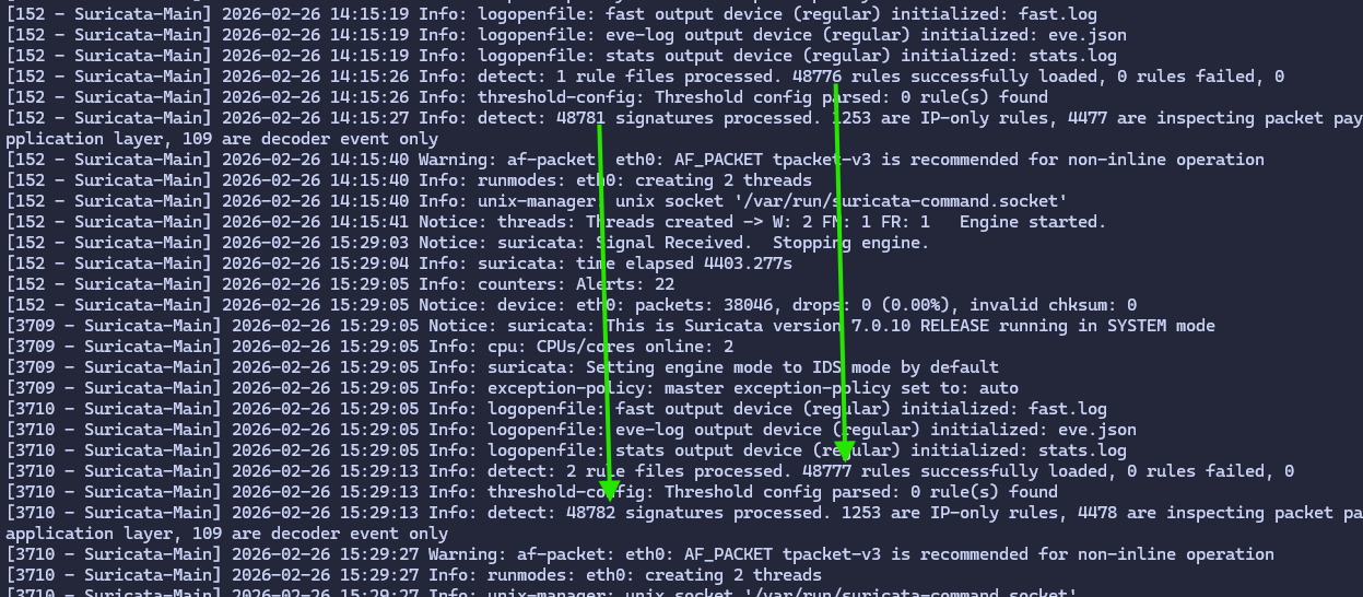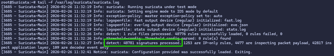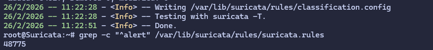 On vérifie le nombre de règles chargées : grep -c "^alert" /var/lib/suricata/rules/suricata.rules