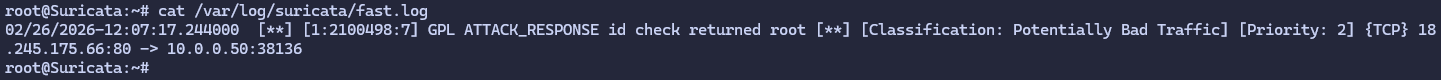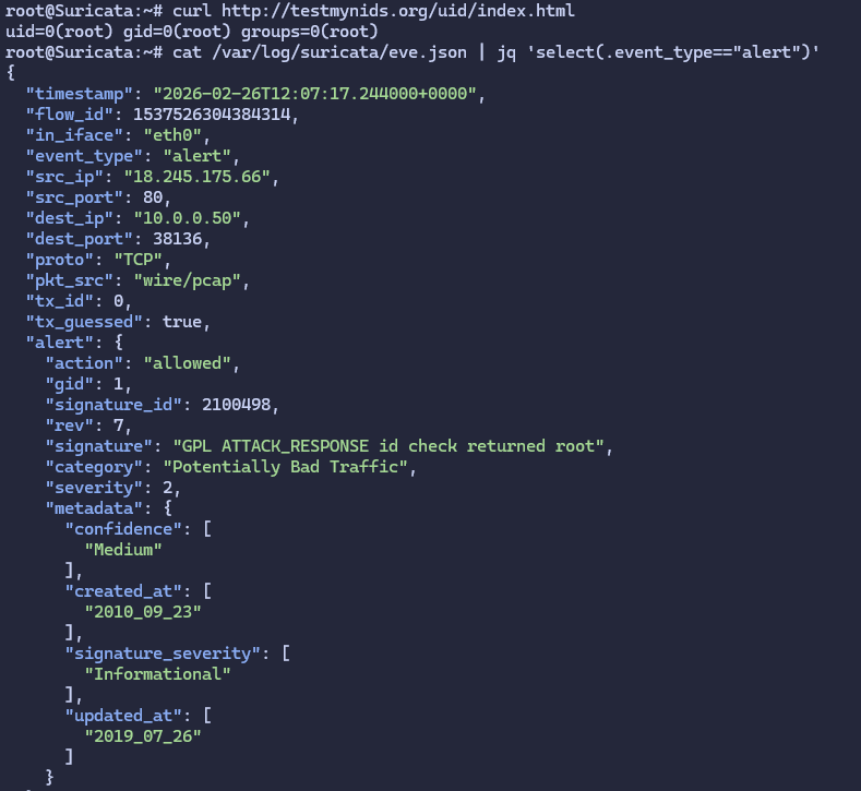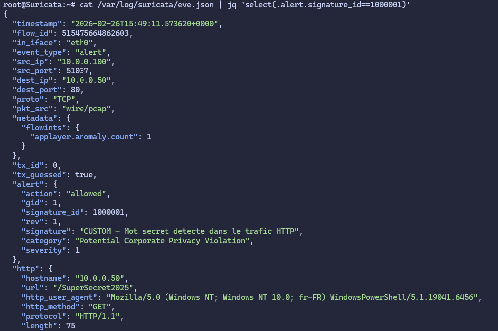 Dans Suricata on peut vérifier avec cat /var/log/suricata/eve.json | jq 'select(.alert.signature_id==1000001)'