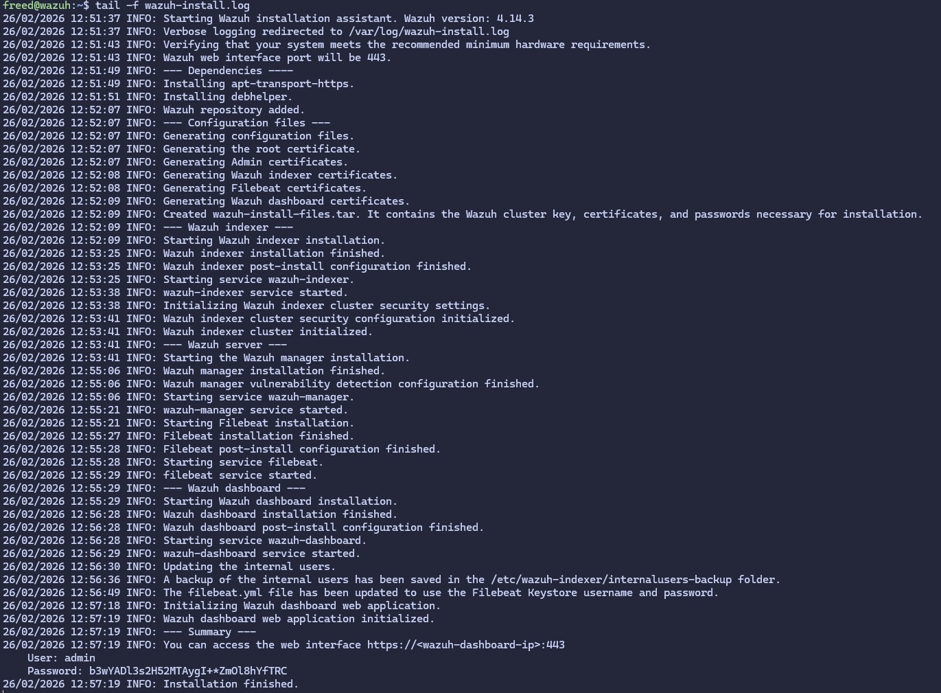 curl -sO https://packages.wazuh.com/4.14/wazuh-install.sh && sudo bash ./wazuh-install.sh -a > wazuh-install.log