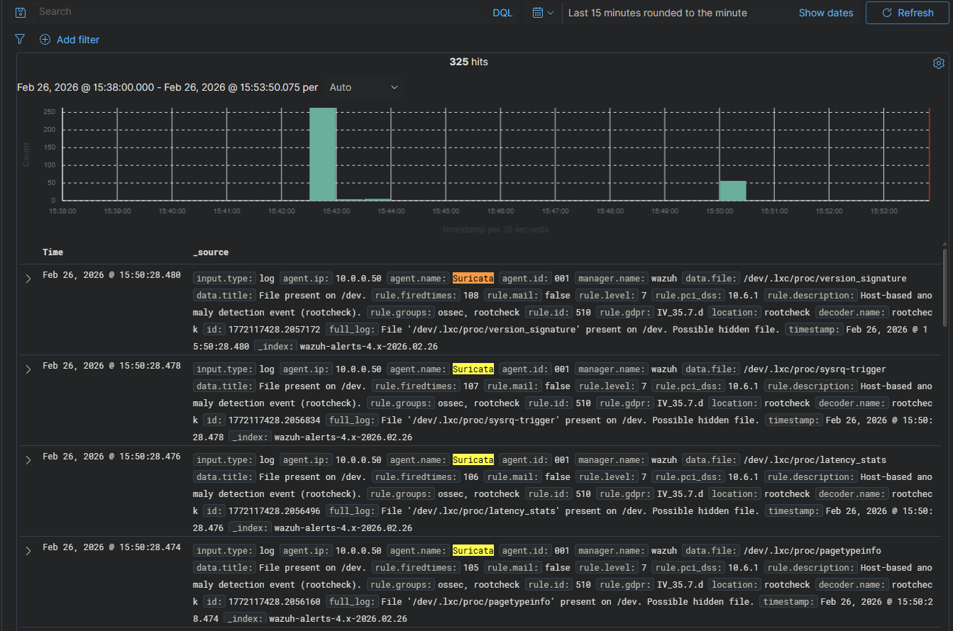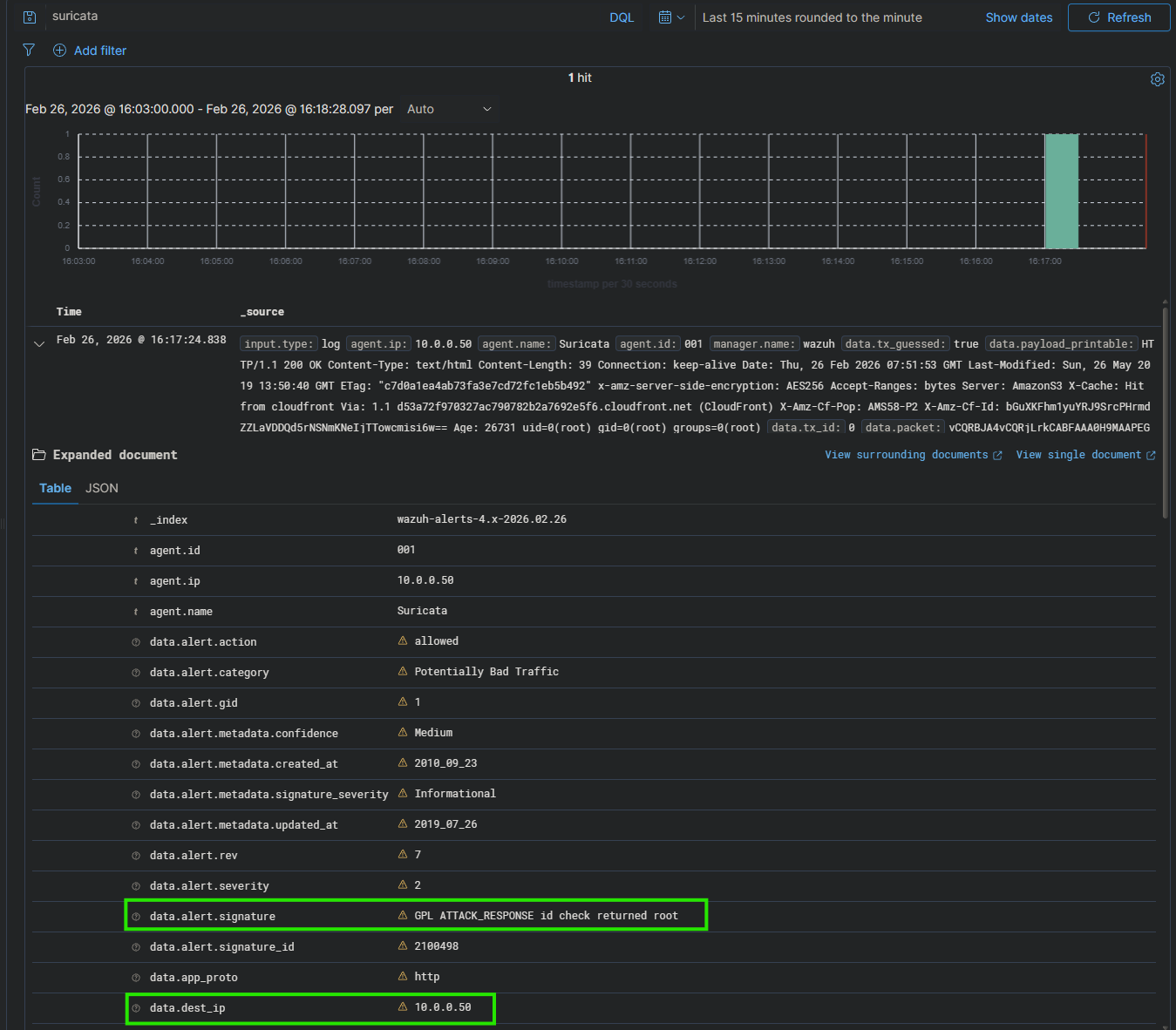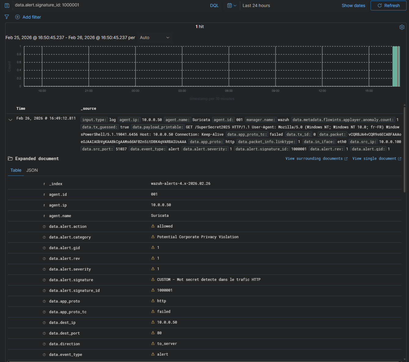 Dans le Dashboard Wazuh : Discover → recherche data.alert.signature_id: 1000001