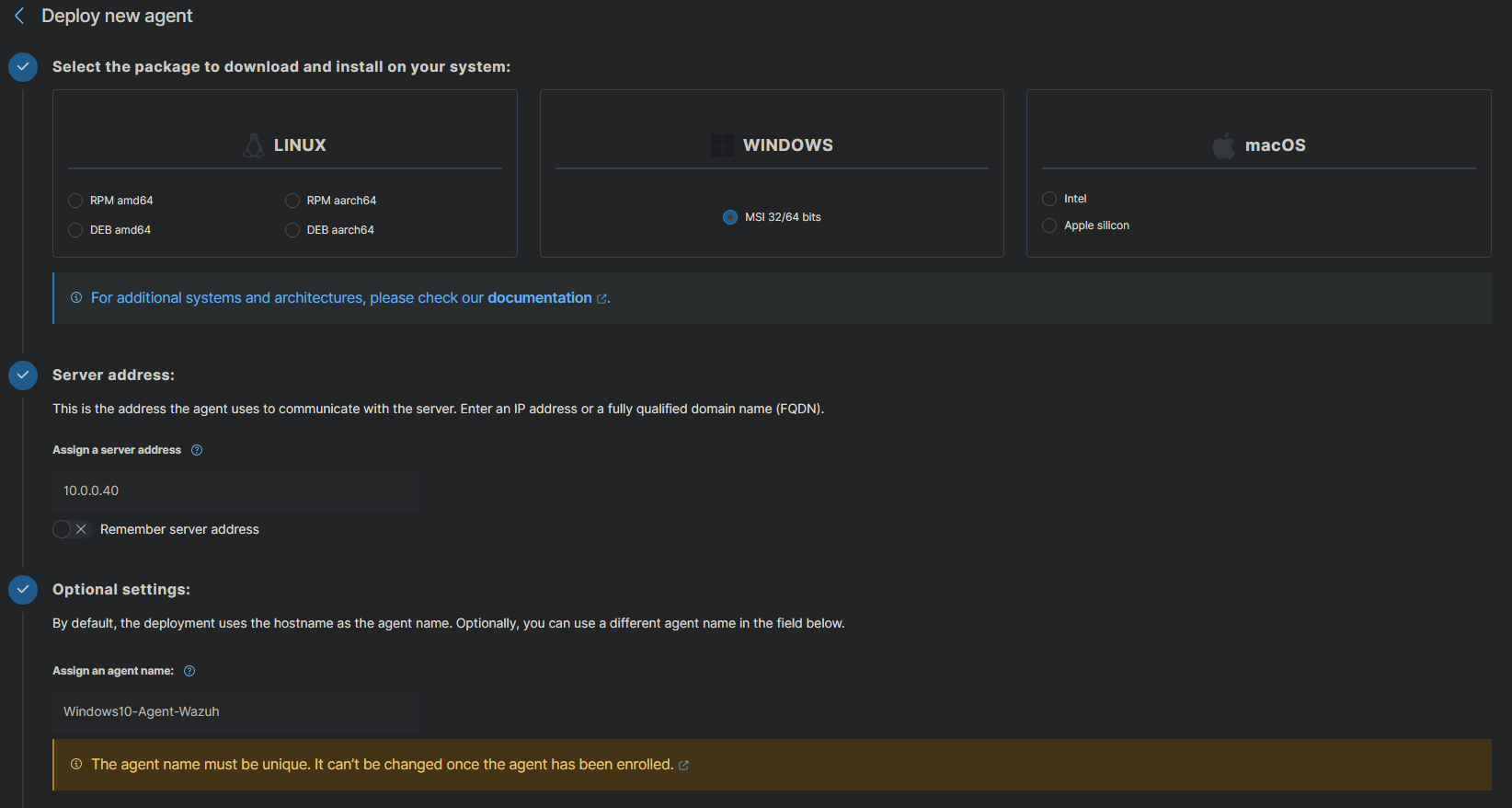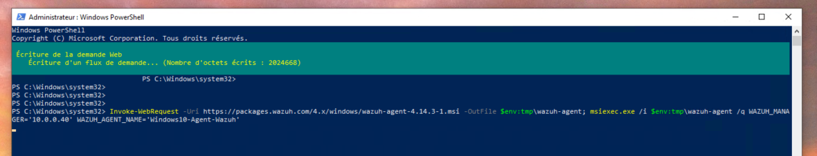 Invoke-WebRequest -Uri https://packages.wazuh.com/4.x/windows/wazuh-agent-4.14.3-1.msi -OutFile $env:tmp\wazuh-agent; msiexec.exe /i $env:tmp\wazuh-agent /q WAZUH_MANAGER='10.0.0.40' WAZUH_AGENT_NAME='Windows10-Agent-Wazuh'
