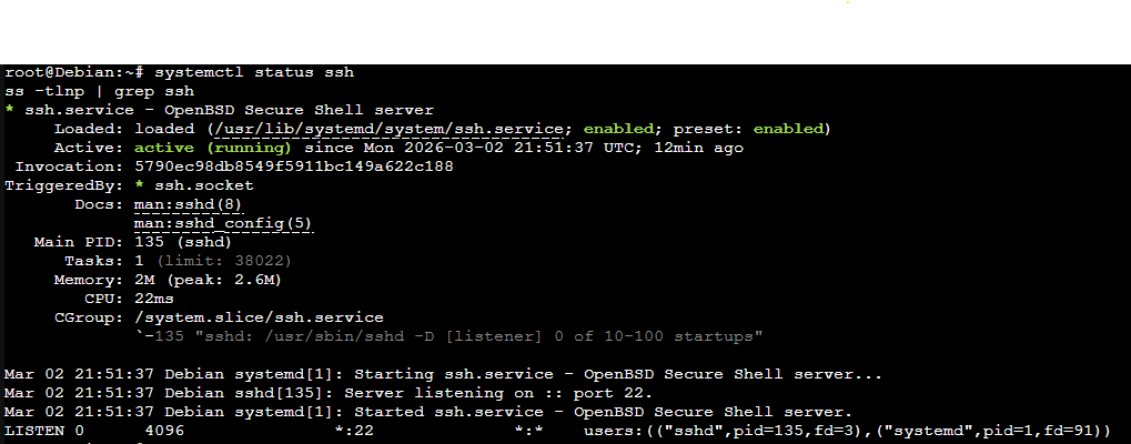 Un nouveau serveur sous Debian doit être déployé en urgence pour héberger un futur service interne. Avant sa mise en production, l’équipe sécurité exige un durcissement minimal du système et une restriction stricte des accès SSH.