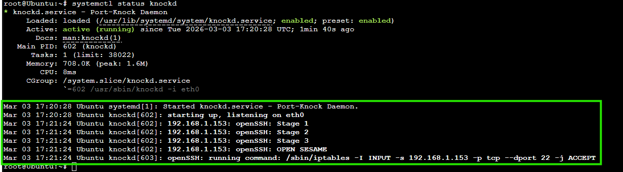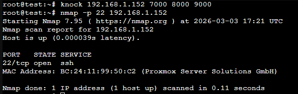 Le port-knocking masque complètement SSH aux scanners : tant que la bonne séquence de ports n'est pas envoyée, le port 22 n'est tout simplement pas visible.