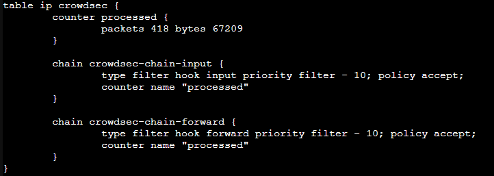 (On doit y voir une table nommée crowdsec (souvent ip crowdsec ou inet crowdsec), contenant un set (ensemble d'adresses IP) appelé crowdsec-blacklists et une règle ordonnant un drop immédiat pour les adresses de ce set).