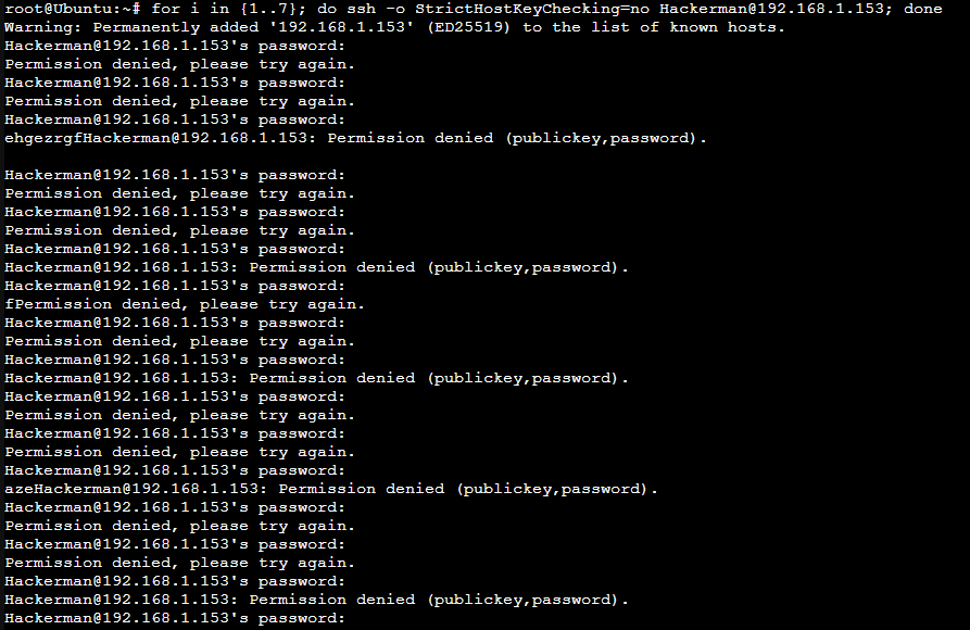 for i in {1..7}; do ssh -o StrictHostKeyChecking=no Hackerman@192.168.1.153; done