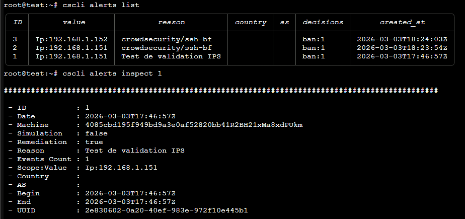 cscli decisions add -i 192.168.1.151 -r "Test de validation IPS"