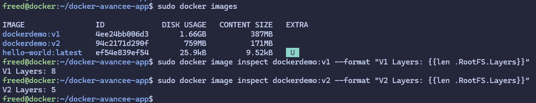 sudo docker image inspect dockerdemo:v2 --format "V2 Layers: {{len .RootFS.Layers}}"