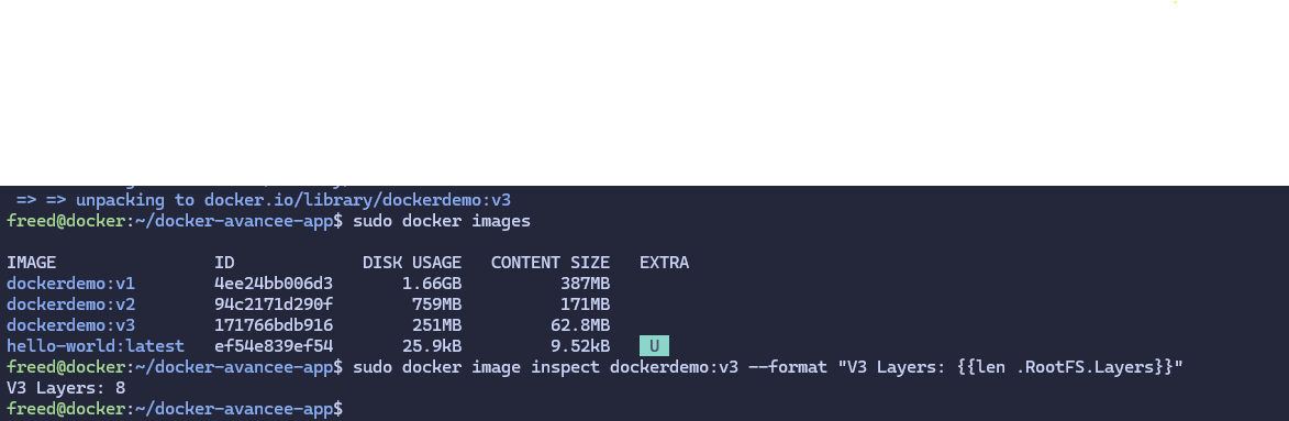sudo docker image inspect dockerdemo:v1 --format "V1 Layers: {{len .RootFS.Layers}}"