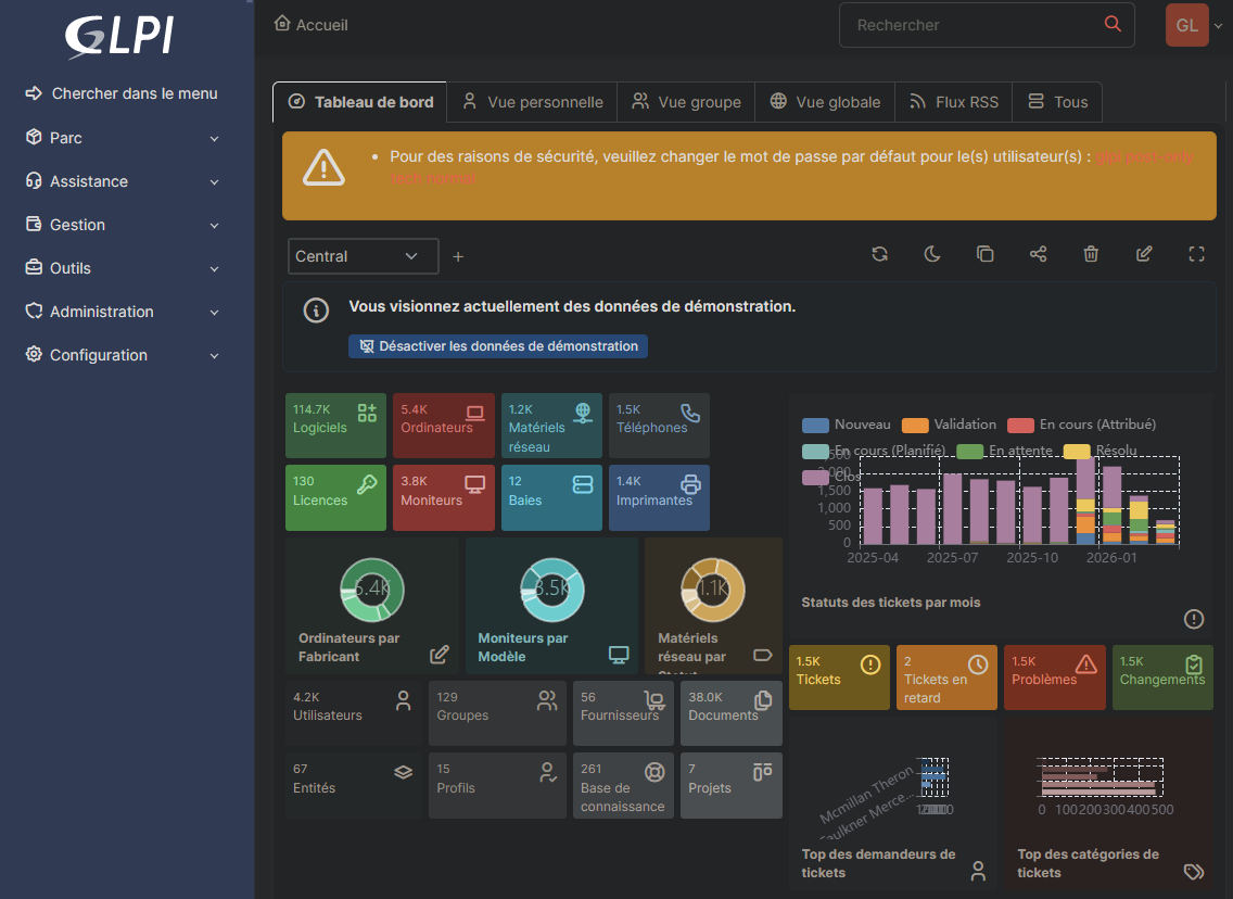 glpi/glpi, il est impératif de modifier immédiatement les mots de passe des comptes par défaut (glpi,tech,normal,post-only) et de supprimer le fichier d'installation (ou laisser GLPI avertir de ce risque de sécurité).