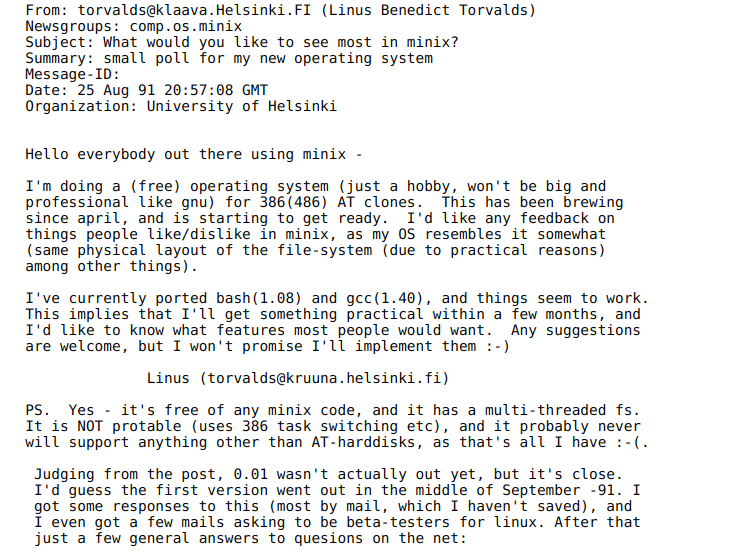 - Linux (1991) : Linus Torvalds développe un noyau (kernel) monolithique. En le combinant avec les outils du projet GNU, le système d'exploitation complet GNU/Linux est né.