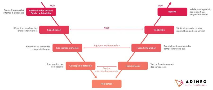- Cycle en V : Amélioration de la cascade. Chaque phase de conception a sa phase de validation associée. Très structuré.