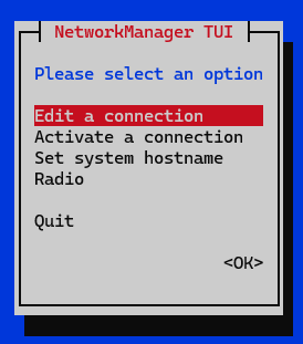 Lancer sudo nmtui pour configurer l'interface réseau :