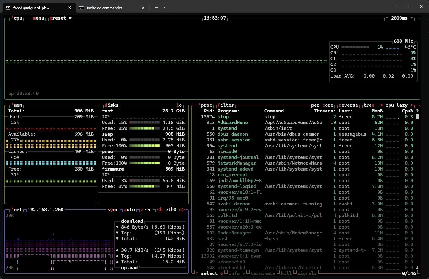 - Supervision : Btop (ressources temps réel) + tableau de bord AdGuard Home (stats DNS)