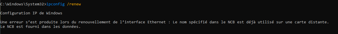 Symptôme 1 — PC Windows : impossible de renouveler l'adresse IP après redémarrage. Erreur NCB (Network Control Block) dans les logs :